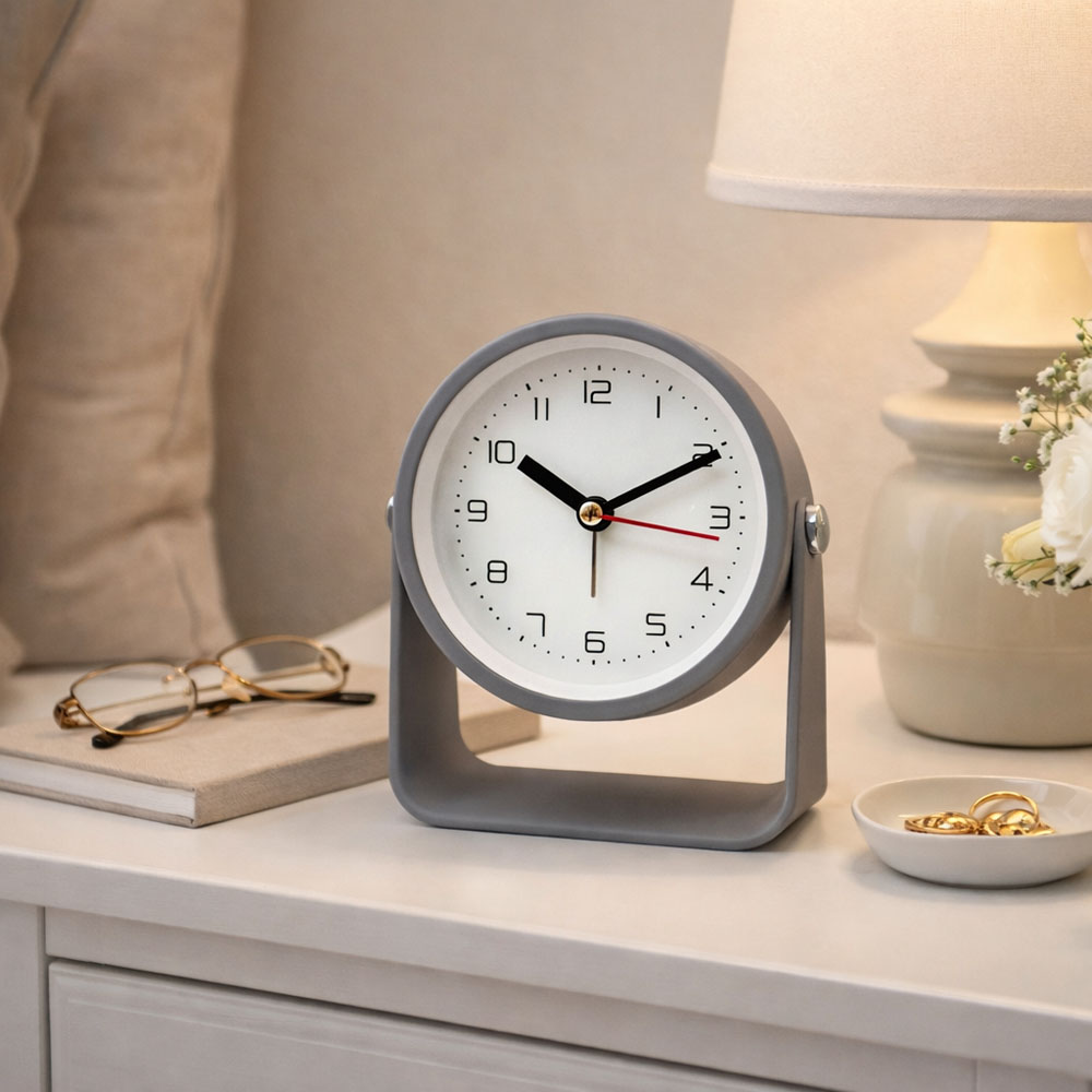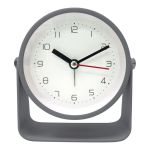 Ξυπνητήρι μεταλλικό με μοντέρνο και ιδιαίτερο σχεδιασμό, ιδανικό για το κομοδίνο ή το γραφείο. Το καθαρό καντράν με ευδιάκριτους αριθμούς εξασφαλίζει άνετη ανάγνωση της ώρας, ενώ οι λεπτομέρειες στους δείκτες προσθέτουν μια διακριτική πινελιά. Διαθέτει αθόρυβο μηχανισμό για ήρεμη λειτουργία χωρίς ενοχλητικούς ήχους, καθώς και φωτάκι για τη νύχτα, ώστε να βλέπετε εύκολα την ώρα σε χαμηλό φωτισμό.