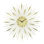 Ρολόι τοίχου με μεταλλικό πλαίσιο και χρυσό φινίρισμα, εμπνευσμένο από τον σχεδιασμό του ήλιου. Οι ακτίνες του σχηματίζονται από λεπτά μεταλλικά στοιχεία, με διακοσμητικές λεπτομέρειες που προσθέτουν δυναμισμό και στυλ.