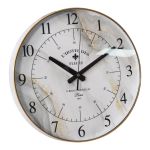 Ρολόι τοίχου με πλαστικό πλαίσιο και καντράν σε μαρμάρινη όψη με χρυσές λεπτομέρειες. Οι μαύροι αριθμοί και δείκτες δημιουργούν αντίθεση, ενώ το σχέδιο L'Hotel des Fleurs προσδίδει μια αίσθηση κομψότητας και φινέτσας.