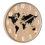 Ρολόι τοίχου με πλαστικό πλαίσιο και καντράν με ξύλινη όψη, διακοσμημένο με χάρτη του κόσμου σε μαύρο χρώμα. Οι λευκοί αριθμοί και οι χρυσοί δείκτες προσδίδουν μια κομψή και μοντέρνα εμφάνιση, ενώ ο χάρτης δίνει έναν διαχρονικό χαρακτήρα.