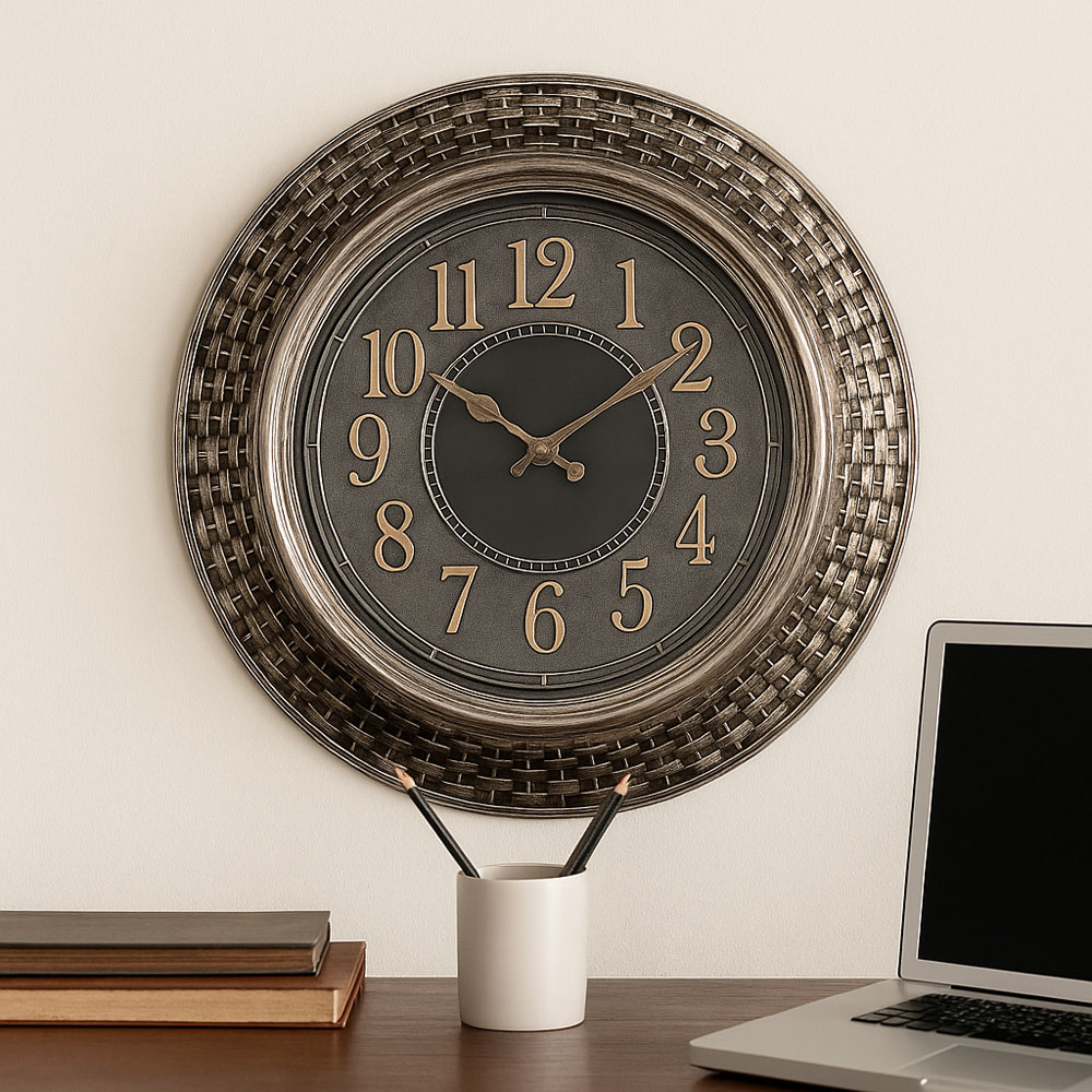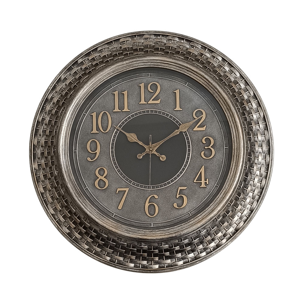 Ρολόι τοίχου με πλαστικό πλαίσιο σε ασημί αντικέ απόχρωση και ανάγλυφη πλέξη περιμετρικά. Διαθέτει χρυσούς αριθμούς και δείκτες που αναδεικνύουν τον κομψό και ρετρό χαρακτήρα του. Ο αθόρυβος μηχανισμός του το καθιστά ιδανικό για κάθε χώρο.