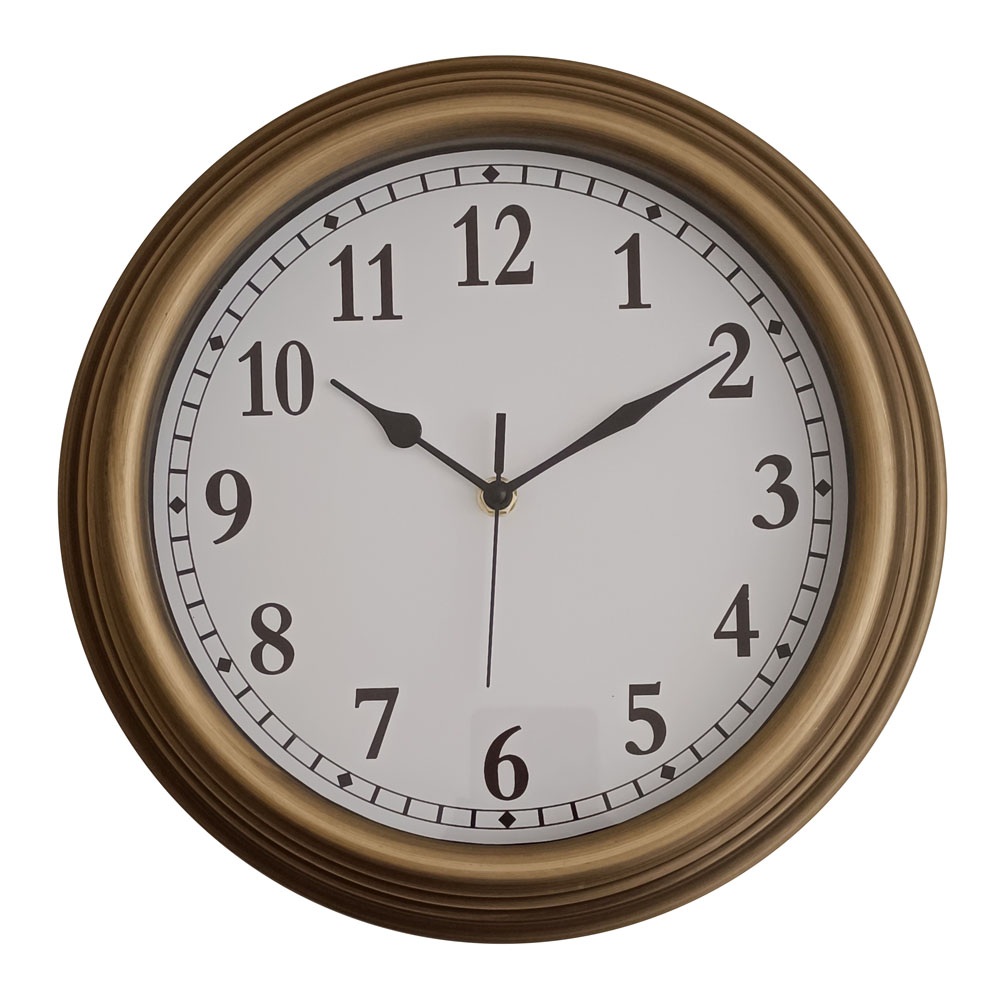 Ρολόι τοίχου με πλαστικό πλαίσιο σε χρυσή αντικέ απόχρωση και λευκό καντράν. Οι μαύροι αριθμοί και δείκτες του προσφέρουν ευδιάκριτη ένδειξη της ώρας, ενώ ο αθόρυβος μηχανισμός εξασφαλίζει ήρεμη λειτουργία. Ιδανικό για κάθε χώρο με κλασικό ή μοντέρνο στυλ