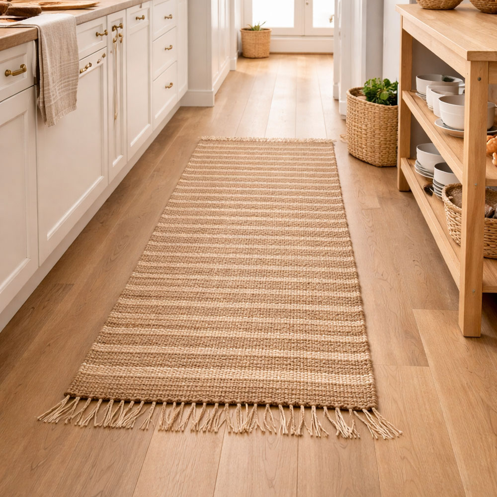 Χαλί κατασκευασμένο από γιούτα και βαμβάκι, με ριγέ σχέδιο σε γήινες αποχρώσεις και τελείωμα με κρόσσια που αναδεικνύει τον φυσικό και ζεστό χαρακτήρα του. Η υφή των φυσικών υλικών προσφέρει σταθερό πάτημα και ανθεκτικότητα, ενώ η πυκνότητα 1600 gsm εξασφαλίζει ποιοτική αίσθηση και άνεση στην καθημερινή χρήση. Ο διακριτικός χρωματικός συνδυασμός και το επαναλαμβανόμενο μοτίβο το καθιστούν ιδανικό για κουζίνα, καθιστικό, υπνοδωμάτιο ή επαγγελματικό χώρο.