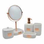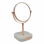Καθρέφτης επιτραπέζιος, μεταλλικός σε rose gold χρώμα με πολυεστερική άσπρη βάση με ανάγλυφες ρίγες και επιγραφή Bath. Διαθέτει δύο όψεις, η μια κανονική και η άλλη με μεγέθυνση.