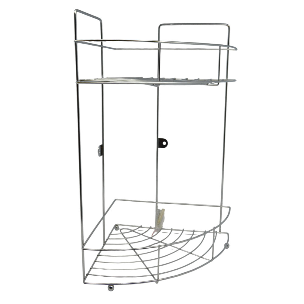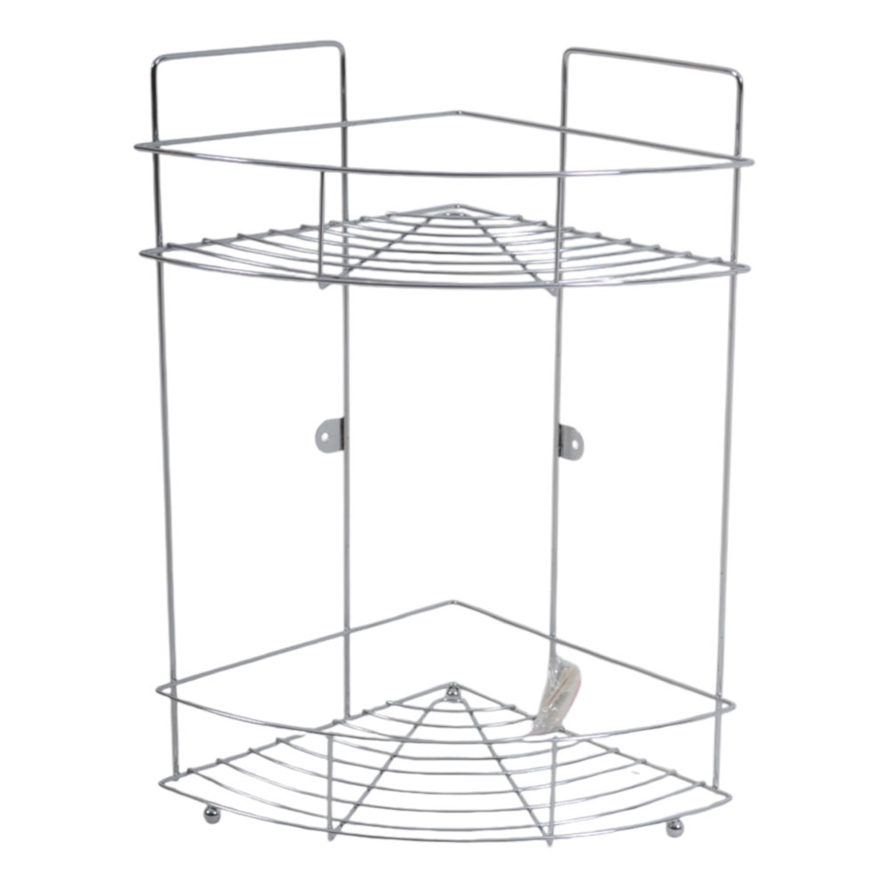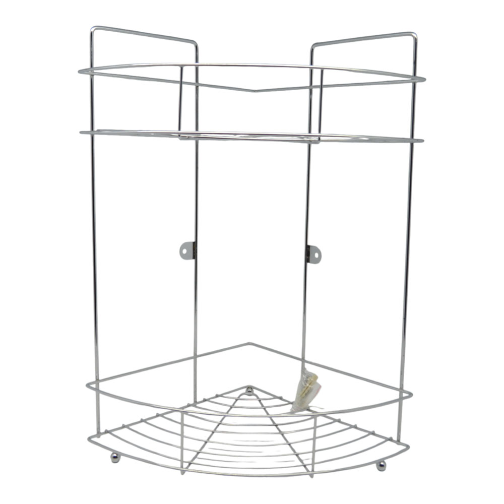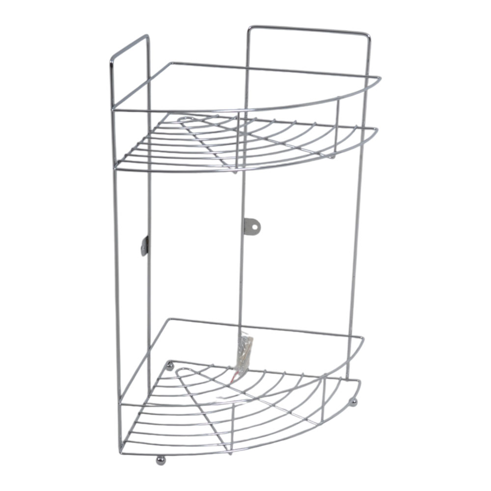 Ραφιέρα μπάνιου γωνιακή, μεταλλική σε ασημί χρώμα, δύο θέσεων, με δυνατότητα να κρεμαστεί και στον τοίχο.