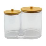 Διάφανο ακρυλικό βάζο διπλό με καπάκια από ξύλο μπαμπού, ιδανικά για μπατονέτες ή βαμβάκι ντεμακιγιάζ. Είναι διάφανα για να βλέπετε στο εσωτερικό τους, καθαρίζονται εύκολα και είναι ιδιαίτερα ανθεκτικά.