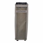Υφασμάτινο καλάθι απλύτων στο χρώμα της άμμου, διακοσμημένο με την επιγραφή LAUNDRY. Διαθέτει 4 ροδάκια για εύκολη μετακίνηση και αναδιπλώνεται για άνετη αποθήκευση όταν δεν χρησιμοποιείται. Κλείνει στην κορυφή με κορδόνι και έχει χωρητικότητα 40 λίτρων.