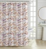 Κουρτίνα πολυεστερική 90gsm, αδιάβροχη, σε άσπρο χρώμα με διακόσμηση φύλλα σε γήινες αποχρώσεις. Στην συσκευασία συμπεριλαμβάνονται δώδεκα πλαστικοί κρίκοι. Είναι εύκολη στο καθάρισμα, μαλακή και ευχάριστη αν έρθει σε επαφή με το δέρμα.