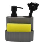 Σαπουνοθήκη για υγρό σαπούνι πολυεστερική σε γκρι ματ χρώμα, με ανάγλυφη επιφάνεια. Περιλαμβάνει θήκη για σφουγγάρι και βουρτσάκι πιάτων. Ο πρακτικός του σχεδιασμός εξοικονομεί χώρο, διατηρώντας τον πάγκο τακτοποιημένο και κομψό.