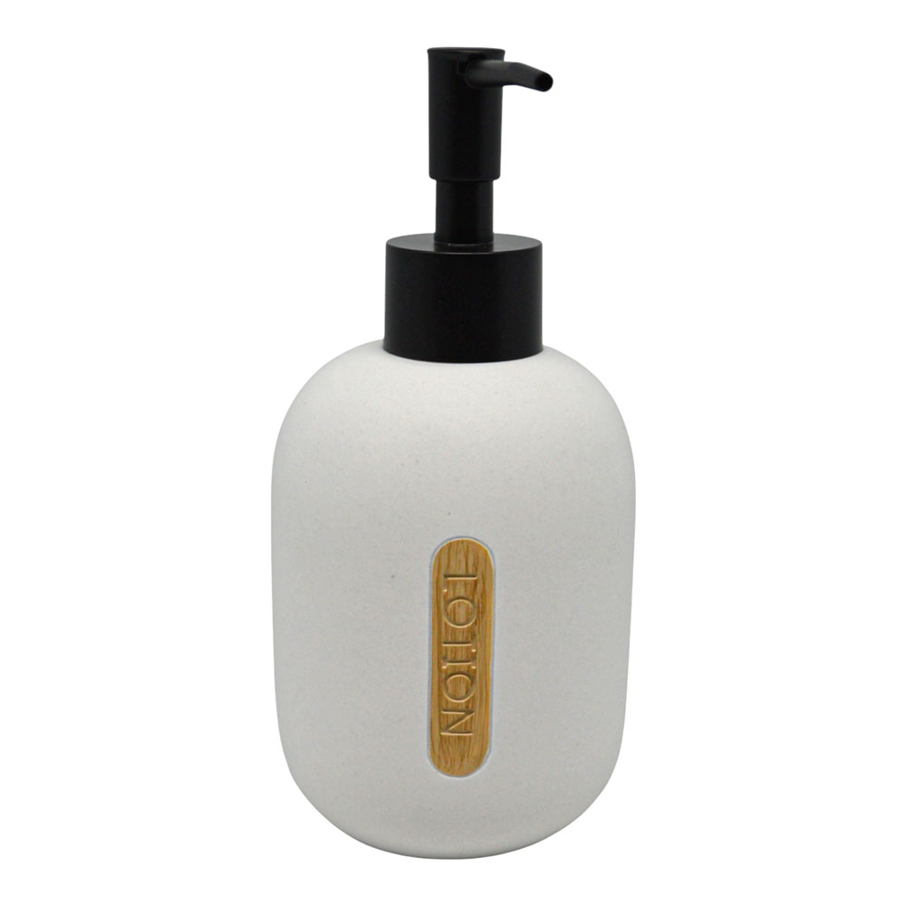 Σαπουνοθήκη για υγρό σαπούνι με μοντέρνο σχεδιασμό, κατασκευασμένο από ανθεκτικό πολυεστερικό υλικό με ελαφρώς ανάγλυφη, σαγρέ επιφάνεια που προσθέτει ξεχωριστό χαρακτήρα. Διαθέτει πρακτική μαύρη αντλία για εύκολη και ελεγχόμενη χρήση, ενώ η ξύλινη λεπτομέρεια στο μπροστινό μέρος ενισχύει τη φυσική αισθητική του.