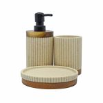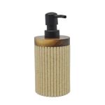 Σαπουνοθήκη για υγρό σαπούνι πολυεστερική, σε μπεζ χρώμα με διακόσμηση ανάγλυφες γραμμές, ξύλο ακακίας στο πάνω μέρος και αντλία σε μαύρο ματ χρώμα. Αξεσουάρ μπάνιου εξαιρετικής ποιότητας με μοντέρνο και κομψό σχεδιασμό.