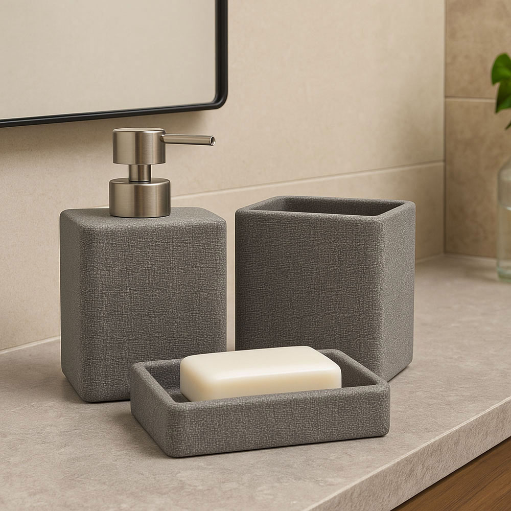 Σαπουνοθήκη για υγρό σαπούνι πολυεστερική σε γκρι χρώμα με σαγρέ υφή και αντλία με ματ φινίρισμα. Ο μοντέρνος και κομψός σχεδιασμός του προσθέτει στυλ στο μπάνιο ενώ το ανθεκτικό υλικό του εξασφαλίζει μακροχρόνια χρήση.
