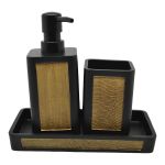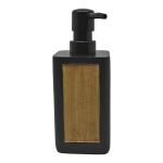 Σαπουνοθήκη για υγρό σαπούνι πολυεστερική, σε μαύρο ματ χρώμα με ξύλινη διακόσμηση στο μπροστινό μέρος. Αξεσουάρ μπάνιου εξαιρετικής ποιότητας με μοντέρνο και κομψό σχεδιασμό.