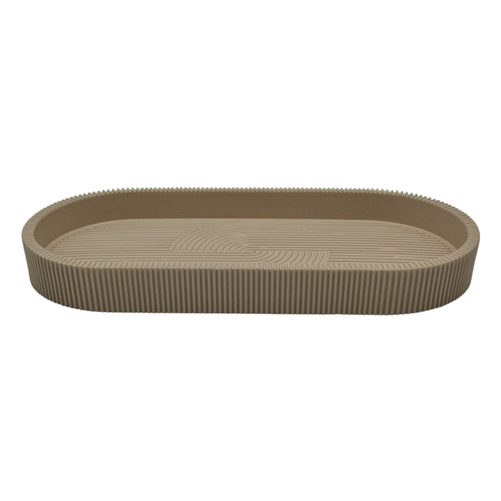 Δίσκος μπάνιου με μοντέρνο σχεδιασμό και κομψό taupe ματ φινίρισμα. Διαθέτει ανάγλυφη υφή με ρίγες που προσδίδουν στυλ και δημιουργούν σταθερή επιφάνεια. Ιδανικός για την οργάνωση αξεσουάρ μπάνιου όπως σαπούνια, ποτηροθήκες ή άλλα μικροαντικείμενα.