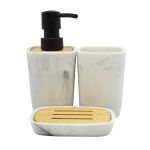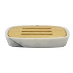 Σαπουνοθήκη πολυεστερική με διακόσμηση εφέ άσπρο μάρμαρο και ξύλο μπαμπού στο πάνω μέρος. Αξεσουάρ μπάνιου εξαιρετικής ποιότητας με μοντέρνο και κομψό σχεδιασμό. Συνδυάστε τα ιδανικά με αντικείμενα της υπόλοιπης σειράς.