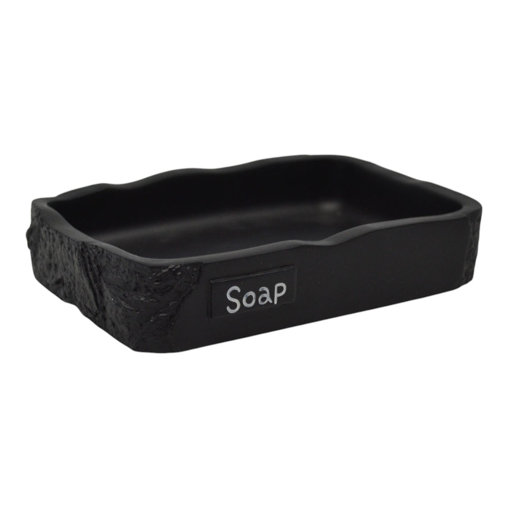 Σαπουνοθήκη πολυεστερική σε μαύρη ματ απόχρωση, με ανάγλυφη επιφάνεια που θυμίζει φυσική πέτρα. Διαθέτει διακριτική ένδειξη Soap, προσφέροντας κομψότητα και μοναδικό χαρακτήρα.