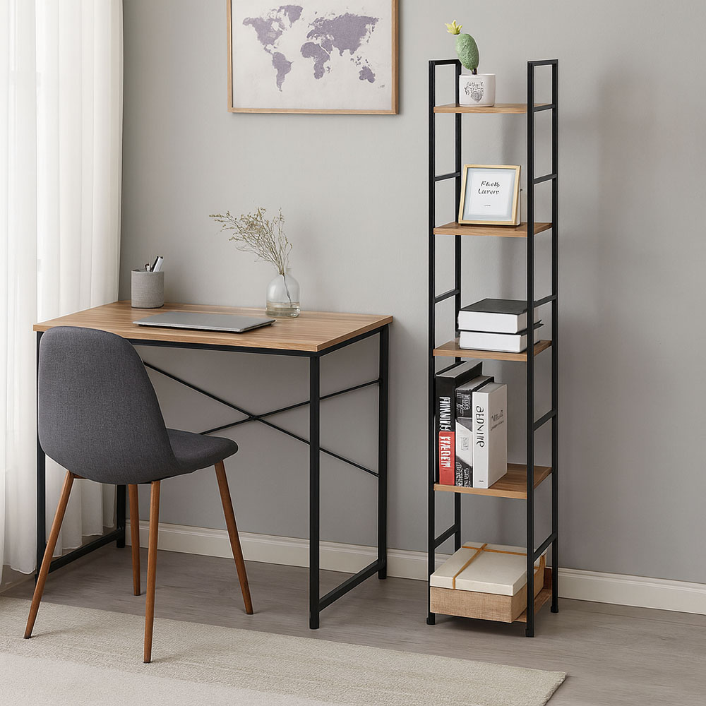 Βιβλιοθήκη με ράφια από μοριοσανίδα και επένδυση μελαμίνης, ανθεκτική στη φθορά και τον χρόνο, σε φυσικό χρώμα. Ο μαύρος μεταλλικός σκελετός προσφέρει σταθερότητα και αναδεικνύει καλαίσθητα τον minimal σχεδιασμό της.