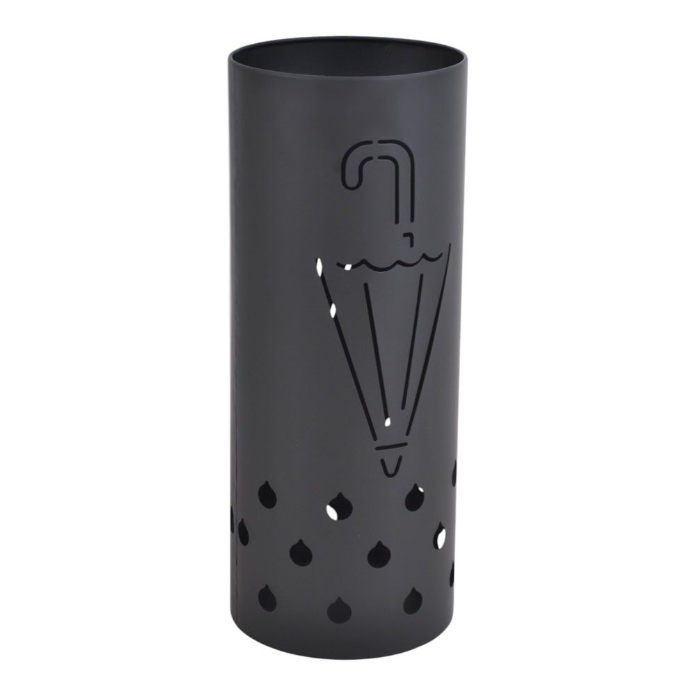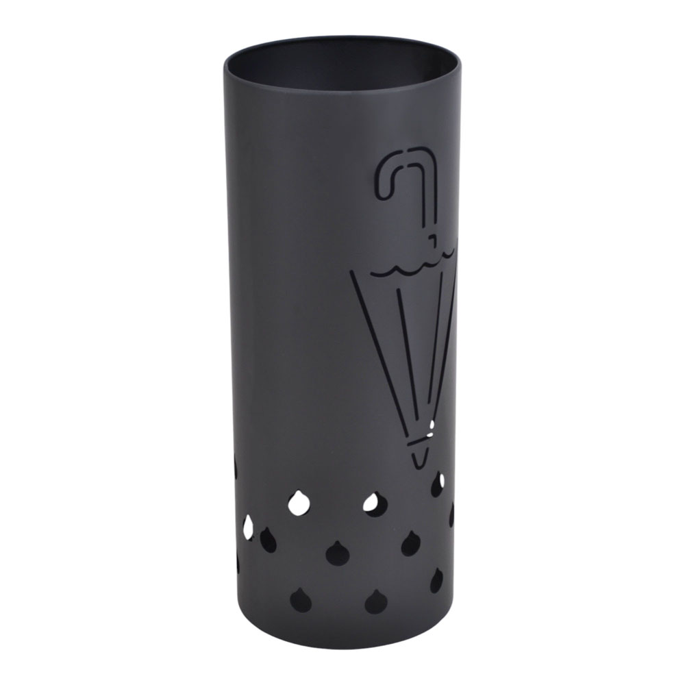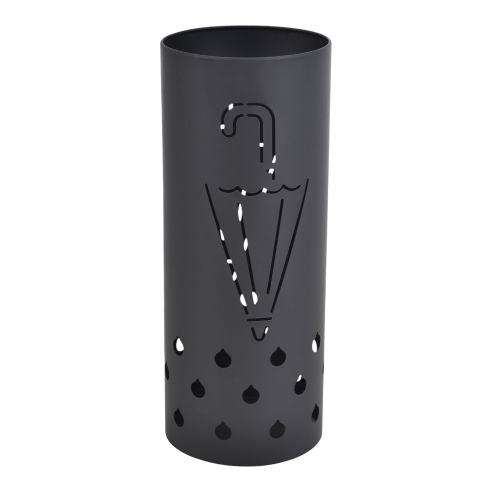 Ομπρελοθήκη μεταλλική στρογγυλή, σε μαύρο ματ χρώμα, με κομψή διάτρητη διακόσμηση ομπρέλας και σταγόνες βροχής. Διαθέτει μεταλλικό πάτο για σταθερότητα και αντοχή στην υγρασία, ενώ ο μοντέρνος σχεδιασμός της προσθέτει διακριτική αισθητική στην είσοδο του