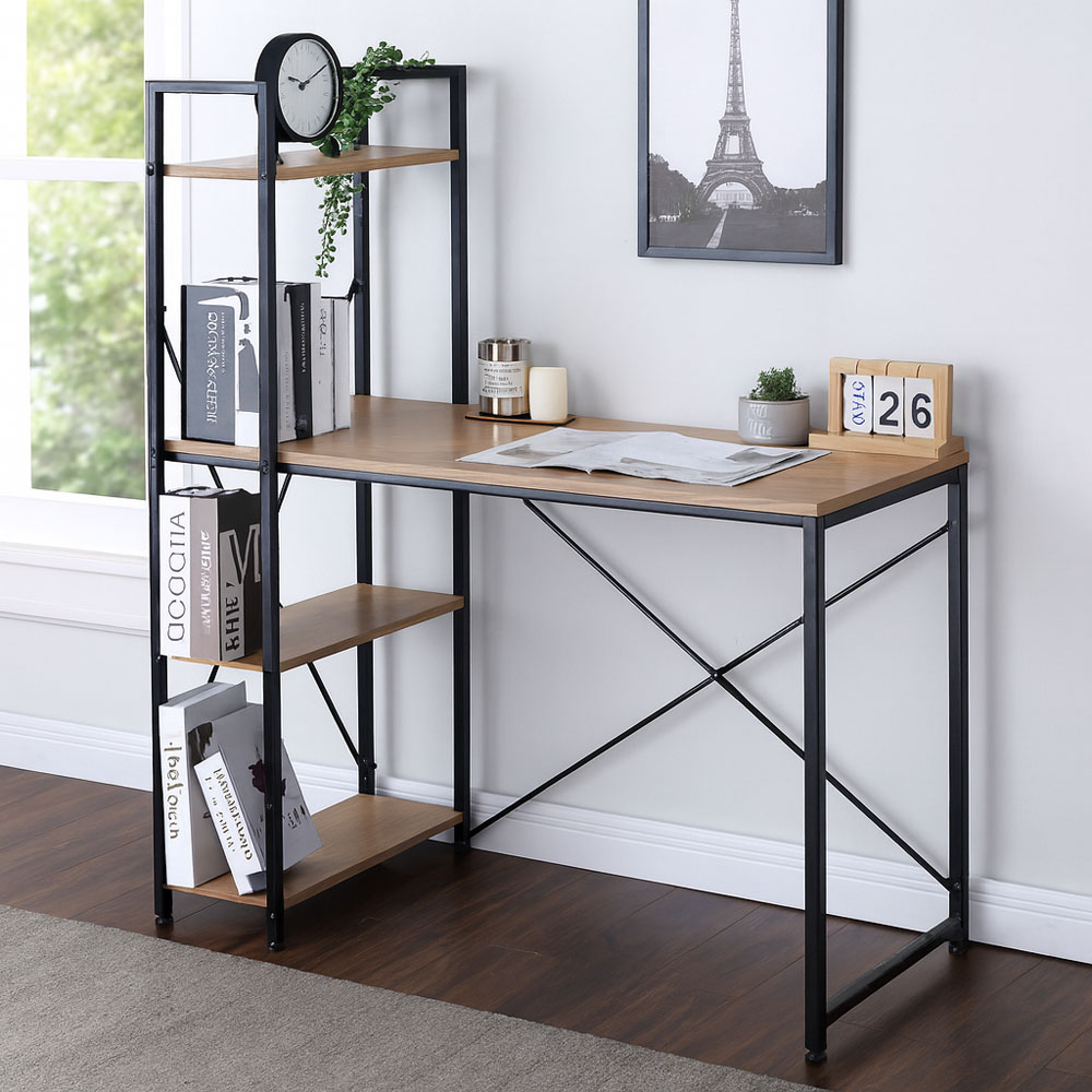 Γραφείο με ανθεκτική επιφάνεια από μοριοσανίδα και επένδυση μελαμίνης, στιβαρό μεταλλικό σκελετό και σταυρωτή ενίσχυση για μεγαλύτερη σταθερότητα. Διαθέτει ενσωματωμένη βιβλιοθήκη με τέσσερα ράφια, προσφέροντας επιπλέον αποθηκευτικό χώρο.