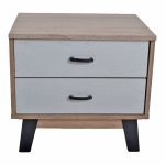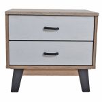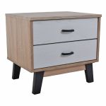 Κομοδίνο ξύλινο σε φυσικό χρώμα με δύο άσπρα συρτάρια και κομψά πόδια σε μαύρο χρώμα. Είναι λειτουργικό με μοντέρνο σχεδιασμό και διαχρονικό στυλ. Στην συσκευασία περιλαμβάνονται οδηγίες συναρμολόγησης.