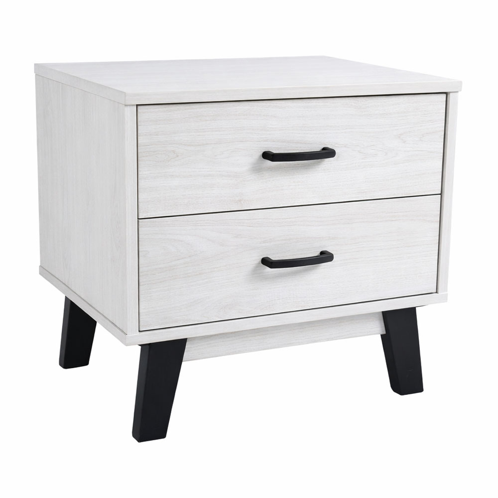 Κομοδίνο ξύλινο με μοντέρνο σχεδιασμό, ιδανικό για το υπνοδωμάτιο ή το καθιστικό. Διαθέτει δύο ευρύχωρα συρτάρια που προσφέρουν πρακτικό αποθηκευτικό χώρο για προσωπικά αντικείμενα. Η λευκή απόχρωση ξύλου σε συνδυασμό με τα μαύρα χερούλια και τα πόδια δημιουργούν μια κομψή αντίθεση, ενώ η σταθερή κατασκευή εξασφαλίζει αντοχή και διάρκεια στον χρόνο.