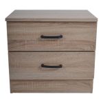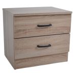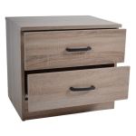 Κομοδίνο ξύλινο σε φυσικό χρώμα με δύο συρτάρια, ιδανικό για πρακτική αποθήκευση δίπλα στο κρεβάτι. Τα μαύρα χερούλια προσθέτουν μοντέρνες πινελιές σε έναν απλό και λειτουργικό σχεδιασμό που ταιριάζει σε κάθε υπνοδωμάτιο.