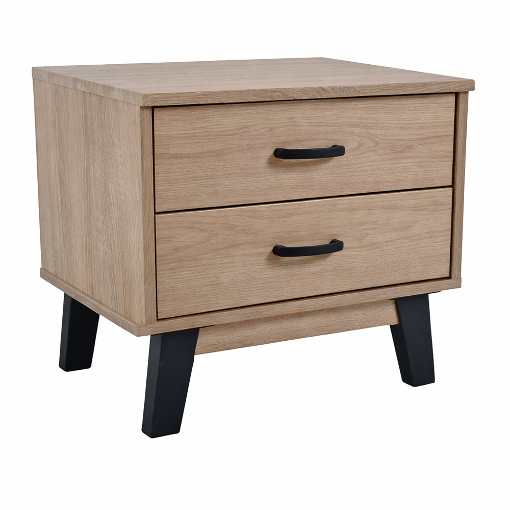 Κομοδίνο ξύλινο με μοντέρνο σχεδιασμό, ιδανικό για το υπνοδωμάτιο ή το καθιστικό. Διαθέτει δύο ευρύχωρα συρτάρια που προσφέρουν πρακτικό αποθηκευτικό χώρο για προσωπικά αντικείμενα. Η φυσική απόχρωση ξύλου σε συνδυασμό με τα μαύρα χερούλια και τα πόδια δημιουργούν μια κομψή αντίθεση, ενώ η σταθερή κατασκευή εξασφαλίζει αντοχή και διάρκεια στον χρόνο.