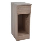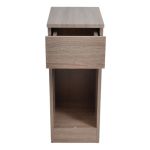 Ξύλινο κομοδίνο σε φυσικό χρώμα με ένα συρτάρι και ανοιχτό χώρο αποθήκευσης. Ο στενός του σχεδιασμός το καθιστά ιδανική επιλογή για μικρούς χώρους, προσφέροντας λειτουργικότητα χωρίς να καταλαμβάνει όγκο.