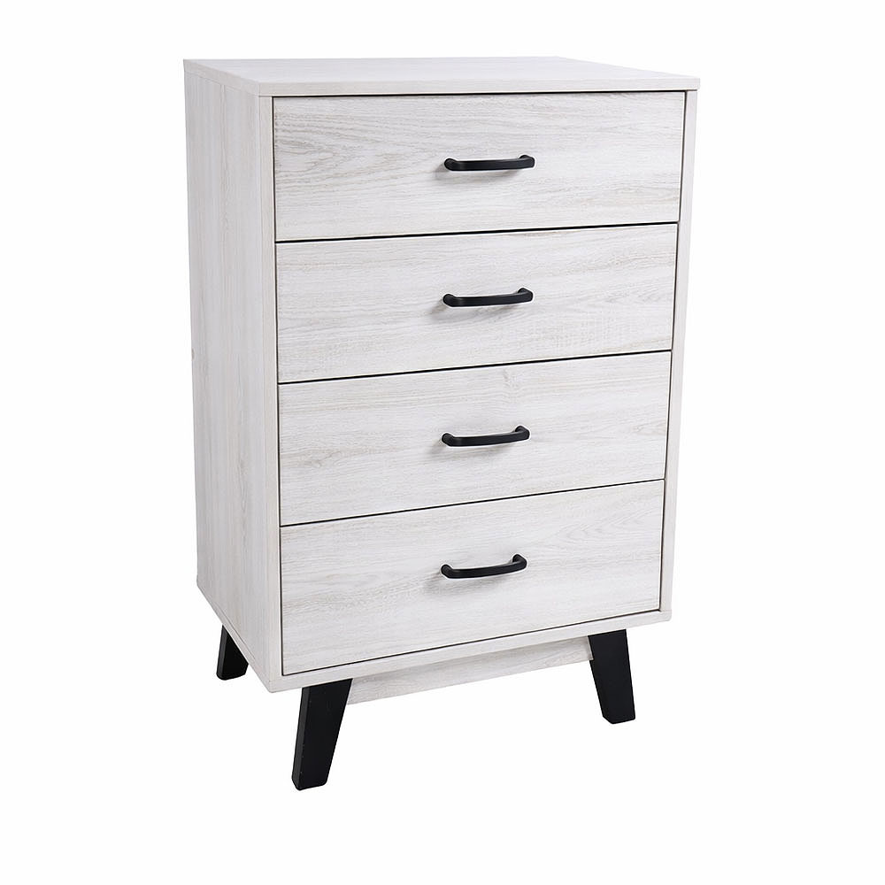 Συρταριέρα με μοντέρνο σχεδιασμό σε λευκή απόχρωση ξύλου, που ταιριάζει εύκολα σε κάθε χώρο. Διαθέτει τέσσερα βαθιά συρτάρια με εξωτερικό ύψος 13εκ. εσωτερικό 11εκ., ιδανικά για αποθήκευση ρούχων και αντικειμένων. Τα χερούλια και τα πόδια σε μαύρο χρώμα δημιουργούν μια κομψή αντίθεση, ενώ η σταθερή κατασκευή εξασφαλίζει αντοχή και διάρκεια στον χρόνο. Ιδανική επιλογή για υπνοδωμάτιο ή καθιστικό.