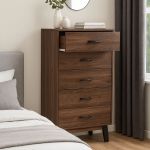 Συρταριέρα ξύλινη σε καρυδί χρώμα με πέντε βαθιά συρτάρια (εξωτερικό ύψος 13εκ. εσωτερικό 11εκ.), κομψά πόδια και χερούλια σε μαύρο χρώμα. Είναι λειτουργική με μοντέρνο σχεδιασμό, ιδανική για πρακτική αποθήκευση.