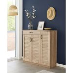 Παπουτσοθήκη ξύλινη με δύο ξεχωριστούς χώρους και ένα συρτάρι, σε φυσική απόχρωση ξύλου με πορτάκια τύπου περσίδας. Διαθέτει εσωτερικούς χώρους μήκους 67εκ. και 35εκ., και δυνατότητα αφαίρεσης δύο ραφιών για την τοποθέτηση ψηλών παπουτσιών όπως μπότες.