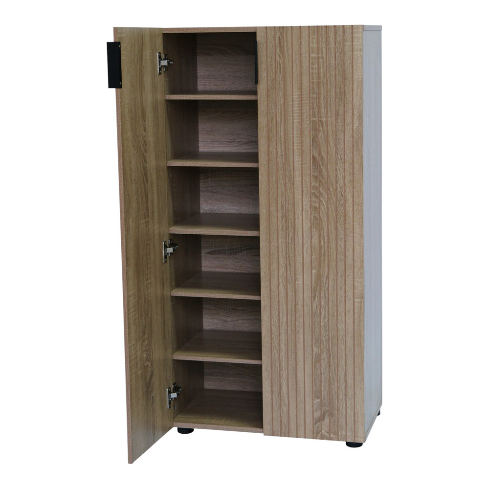 Παπουτσοθήκη από MDF με επένδυση μελαμίνης σε φυσική απόχρωση ξύλου. Διαθέτει πόρτες με εσωτερικά ράφια για οργανωμένη αποθήκευση υποδημάτων. Η όψη φυσικού ξύλου με κάθετες ανάγλυφες γραμμές προσδίδει μοντέρνο και διαχρονικό χαρακτήρα, ενώ το μαύρο μεταλλικό πόμολο εξασφαλίζει πρακτικότητα και διακριτική αντίθεση στον σχεδιασμό. Ανθεκτική στην καθημερινή χρήση και εύκολη στο καθάρισμα, ιδανική για είσοδο, χωλ ή υπνοδωμάτιο.