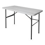 Διαθέτει άσπρη πλαστική επιφάνεια με κομψή όψη ξύλου πάχους 40mm και μεταλλικά πόδια με σωλήνα διαμέτρου 25mm και πάχος 1,00mm. Ανθεκτικό, σταθερό και εύκολο στη μεταφορά. Είναι ιδανικό για οικιακή χρήση καθώς και για επαγγελματίες catering, εκδηλώσεις, χώρους εστίασης και εξωτερική χρήση.