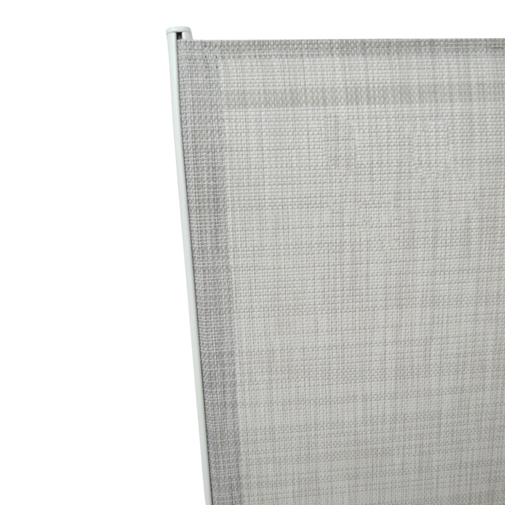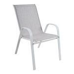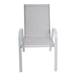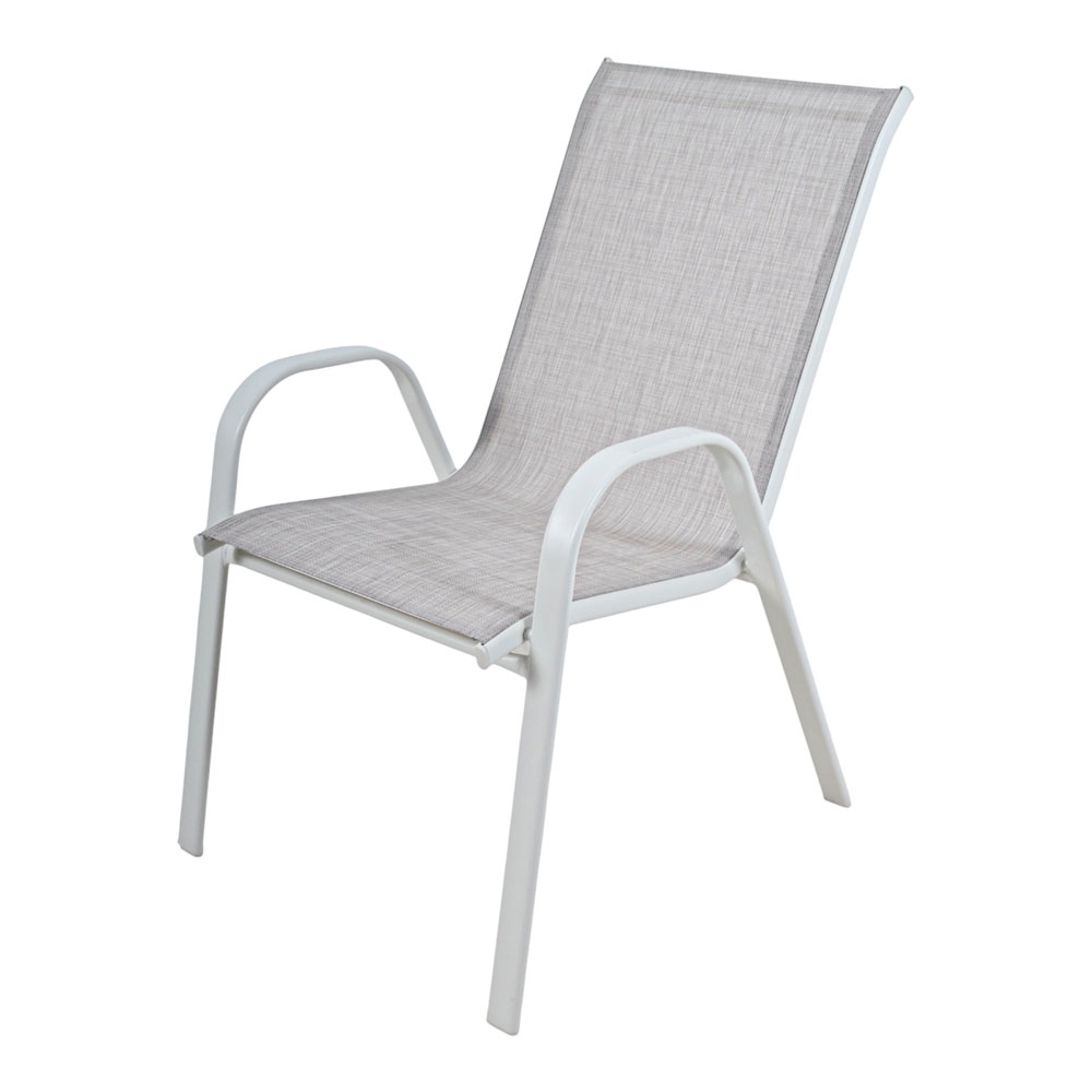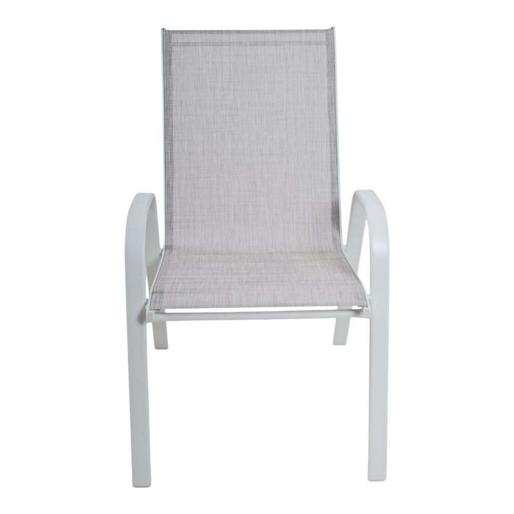 Καρέκλα εξωτερικού χώρου με λευκό μεταλλικό ματ σκελετό και κάθισμα πλάτη από ανθεκτικό ύφασμα textilene σε ανοιχτή γκρι απόχρωση. Το textilene 2x1 προσφέρει υψηλή αντοχή, ελαστικότητα και γρήγορο στέγνωμα, ιδανικό για καθημερινή χρήση σε εξωτερικούς χώρους. Ο εργονομικός σχεδιασμός με μπράτσα εξασφαλίζει άνεση και σωστή στήριξη. Η καρέκλα μπορεί να στοιβαχτεί η μία πάνω στην άλλη, εξοικονομώντας χώρο κατά την αποθήκευση.Ιδανική για χρήση σε μπαλκόνι, κήπο ή βεράντα