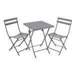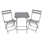 Πτυσσόμενο μεταλλικό σετ τραπεζιού και δύο καρεκλών, ιδανικό για εσωτερικούς ή εξωτερικούς χώρους. Κομψό, ανθεκτικό και σταθερό, με πτυσσόμενο σχεδιασμό για εύκολη αποθήκευση εξοικονομώντας χώρο όταν δεν χρησιμοποιείται.