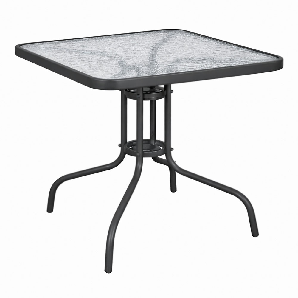 Τραπέζι τετράγωνο εξωτερικού χώρου με ανθρακί ματ μεταλλικό σκελετό, σχεδιασμένο για αντοχή και σταθερότητα. Η επιφάνειά του είναι από γυαλί tempered 5mm με σχέδιο water wave, που προσφέρει ιδιαίτερη αισθητική και αυξημένη ανθεκτικότητα. Τα πόδια κατασκευάζονται από σωλήνα διαμέτρου 24Φx0,9mm, εξασφαλίζοντας στιβαρή κατασκευή και ασφαλή στήριξη. Ιδανικό για χρήση σε μπαλκόνι, κήπο ή βεράντα.