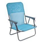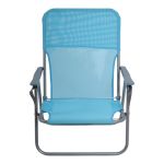 Καρέκλα παραλίας με ψηλή πλάτη, πτυσσόμενη, με μεταλλικό σκελετό διαμέτρου 18mm και επένδυση από ανθεκτικό ύφασμα textilene 1x1 σε γαλάζιο χρώμα. Διαθέτει μπράτσα και ιμάντα μεταφοράς για εύκολη μετακίνηση και αποθήκευση.