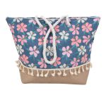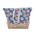 Τσάντα θαλάσσης από ύφασμα και γιούτα με φλοράλ σχέδιο και διακόσμηση μπεζ κρόσσι . Διαθέτει μακριές λαβές από σκοινί, φόδρα στο εσωτερικό με τσεπάκι και κλείνει με φερμουάρ για μεγαλύτερη ασφάλεια.