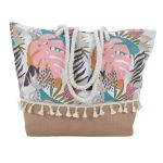 Τσάντα θαλάσσης από ύφασμα και γιούτα με σχέδιο εξωτικά φύλλα και διακόσμηση μπεζ κρόσσι . Διαθέτει μακριές λαβές από σκοινί, φόδρα στο εσωτερικό με τσεπάκι και κλείνει με φερμουάρ για μεγαλύτερη ασφάλεια.