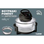 Φουρνάκι ρομπότ με αντίσταση 1400W, πυράντοχο γυάλινο κάδο χωρητικότητας 12lt και δαχτυλίδι προέκτασης 5lt. Διαθέτει χρονόμετρο 60 λεπτών και ρυθμιζόμενο θερμοστάτη έως 250 βαθμούς Κελσίου. Διατηρεί τα θρεπτικά συστατικά και εξοικονομεί χρόνο κ ενέργεια.