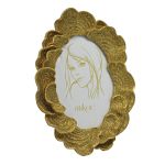 Οβάλ κορνίζα διακοσμημένη με εντυπωσιακά χρυσά ανάγλυφα σχέδια που θυμίζουν στρώσεις από πέταλα λουλουδιών. Το σχήμα και η ανάγλυφη υφή της προσδίδουν έναν αέρα πολυτέλειας και πρωτοτυπίας.