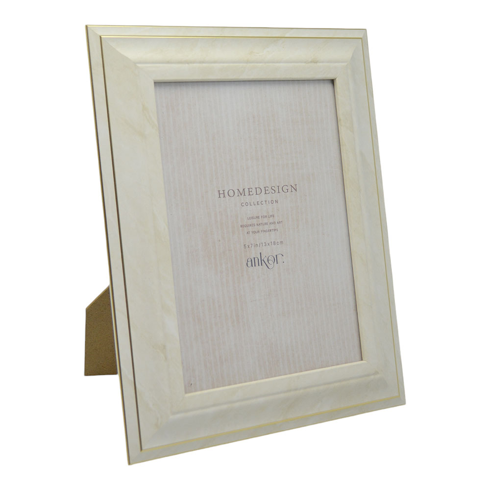 Κορνίζα πλαστική σε μπεζ χρώμα με μαρμάρινη όψη, ανάγλυφες γραμμές και χρυσή λεπτομέρεια στο πλαίσιο. Περιστρέφεται δίνοντας τη δυνατότητα τοποθέτησης οριζόντιας ή κάθετης φωτογραφίας και κρεμιέται στον τοίχο.