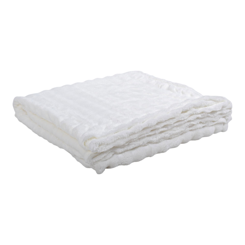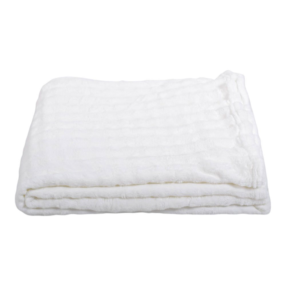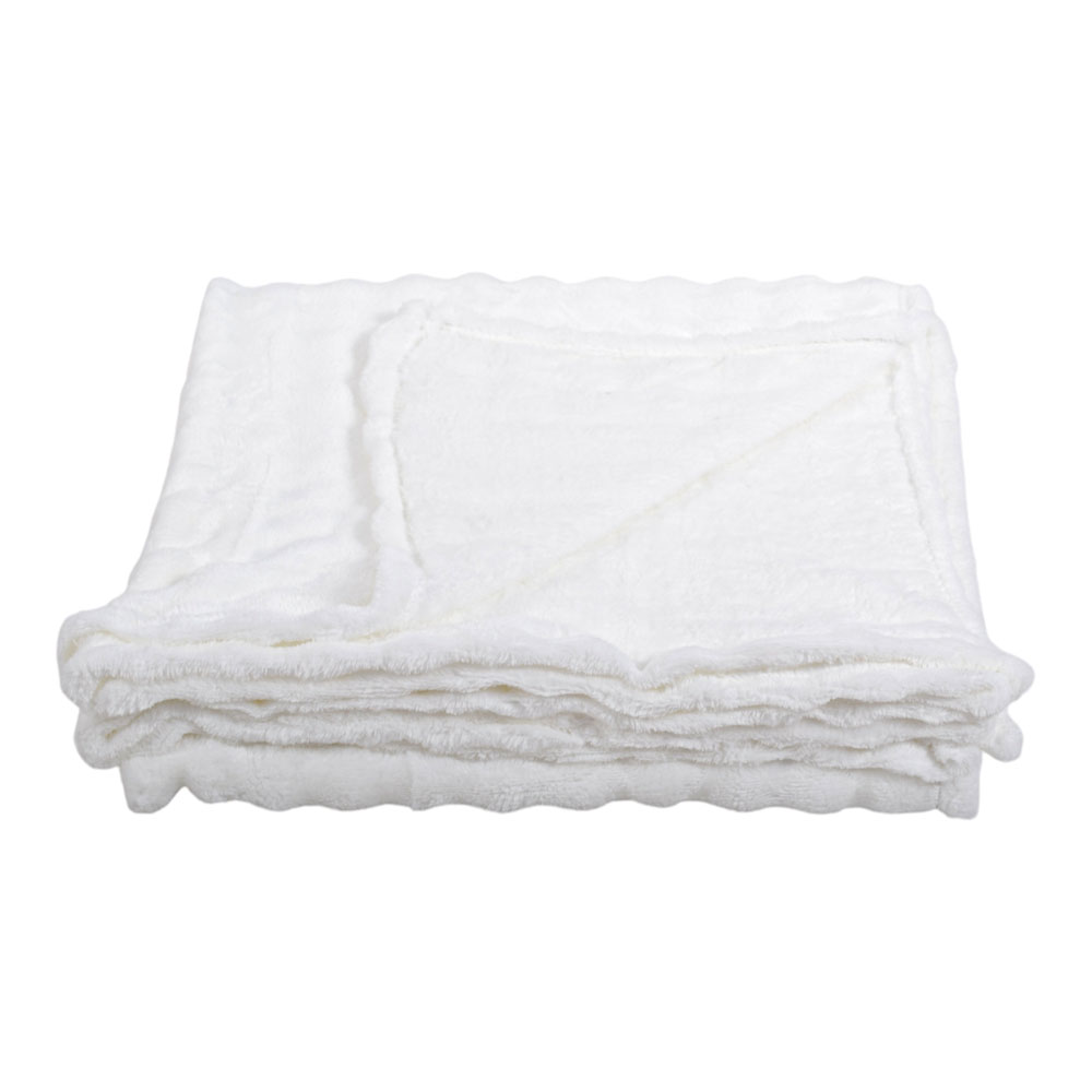 Κουβέρτα fleece με ανάγλυφο σχέδιο, 100% πολυεστερική σε λευκό χρώμα. Απαλή και με βελούδινη υφή, προσφέρει ζεστασιά και άνεση όλες τις εποχές. Ιδανική για κρεβάτι ή καναπέ, πλένεται εύκολα στο πλυντήριο και στεγνώνει γρήγορα.