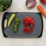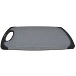 Πλαστική επιφάνεια κοπής σε γκρι χρώμα με διακόσμηση εφέ μάρμαρο. Έχει λαβή για εύκολη χρήση και αντιολισθητικά ποδαράκια για μεγαλύτερη ασφάλεια. Μπορεί να μπει στο πλυντήριο πιάτων.