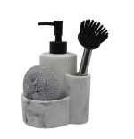 Σαπουνοθήκη για υγρό σαπούνι πολυεστερική με φινίρισμα άσπρο μάρμαρο και θήκες για σφουγγάρι και βουρτσάκι. Στην συσκευασία συμπεριλαμβάνεται το συρμάτινο σφουγγάρι και το βουρτσάκι.