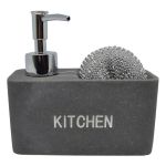 Σαπουνοθήκη για υγρό σαπούνι πολυεστερική με όψη πέτρας γκρι χρώμα και ανάγλυφη επιγραφή KITCHEN σε ασημί χρώμα. Διαθέτει θήκη για σφουγγάρι. Στην συσκευασία συμπεριλαμβάνεται το συρμάτινο σφουγγάρι.