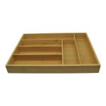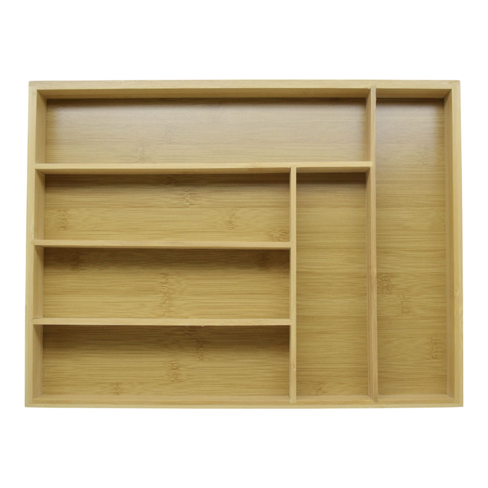 Ξύλινη θήκη οργάνωσης συρταριού από φυσικό bamboo, με έξι χωρίσματα διαφορετικών μεγεθών. Ιδανική για την τακτοποίηση μαχαιροπήρουνων, κουζινικών εργαλείων ή μικροαντικειμένων, διατηρώντας τα πάντα σε τάξη.