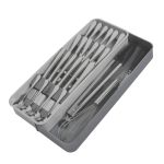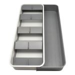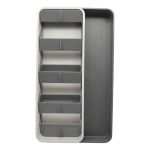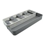 Κουταλοθήκη από ανθεκτικό πλαστικό, με μοντέρνο δίχρωμο σχεδιασμό και πρακτικό μηχανισμό επέκτασης. Προσαρμόζεται στο πλάτος του συρταριού, παρέχοντας επιπλέον χώρο για μεγάλα εργαλεία κουζίνας. Διαθέτει πολλαπλές θήκες για άψογη οργάνωση.