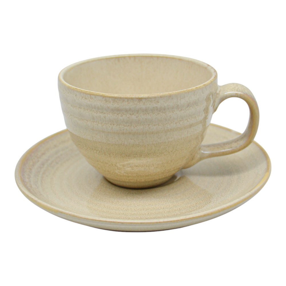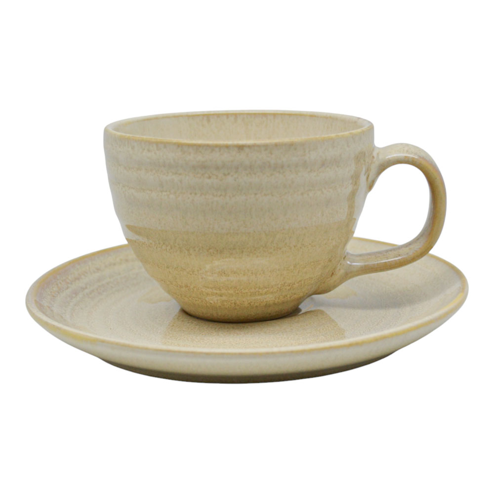 Σετ 6 φλυτζανιών καφέ με πιατάκι, κεραμικά, σε ζεστή μπεζ απόχρωση. Το ελαφρώς κυματιστό σχέδιο στην επιφάνεια χαρίζει φυσική, χειροποίητη αισθητική και διακριτική κομψότητα. Ιδανικά για καφέ ή άλλα ροφήματα, συνδυάζουν στυλ και πρακτικότητα.