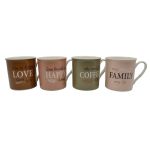 Κούπα από ποιοτική πορσελάνη Bone China, σε τέσσερα διαφορετικά χρώματα καφέ, ροδί, λαδί και ροζ με επιγραφή. Κατάλληλη για πλυντήριο πιάτων και φούρνο μικροκυμάτων. Η συσκευασία περιλαμβάνει και τα τέσσερα σχέδια.